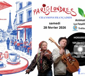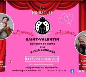 Dimanche 14 février 2026, 20h – ouverture des portes 19h. CONCERT & REPAS. “Le Minuscule” 21 rue des Maurilloux 24750 Trélissac ⭐️ Réservations obligatoires : tél. 06.78.78.16.28 // contact@paris-londres.com Concert “Le petit cirque musical” (chansons originales du duo) et St. Valentin