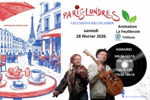 Samedi 31 octobre 2026 Foyer Socio-culturel, Place Magne, 24750 Trélissac 19h apéritif partagé avec les artistes 20h diner concert Places limitées. 38€ adultes (diner-concert), 28€ enfants (12 ans et moins) Concert : participation libre (au chapeau) Sur réservation uniquement – Patrick au 06 77 78 08 66 ⭐️ contact@paris-londres.com